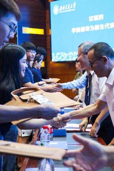 典礼第四项议程是学院领导为新生代表赠礼。礼品既关注学生日常学习需求,又充满成都特色人文关怀,体现了学院对新同学的关心和关爱。伴随着庄严而活泼的音乐,新生代表登上主席台,从学院领导和老师们的手中接过蕴含着对新一代公管人殷切盼意的礼品。