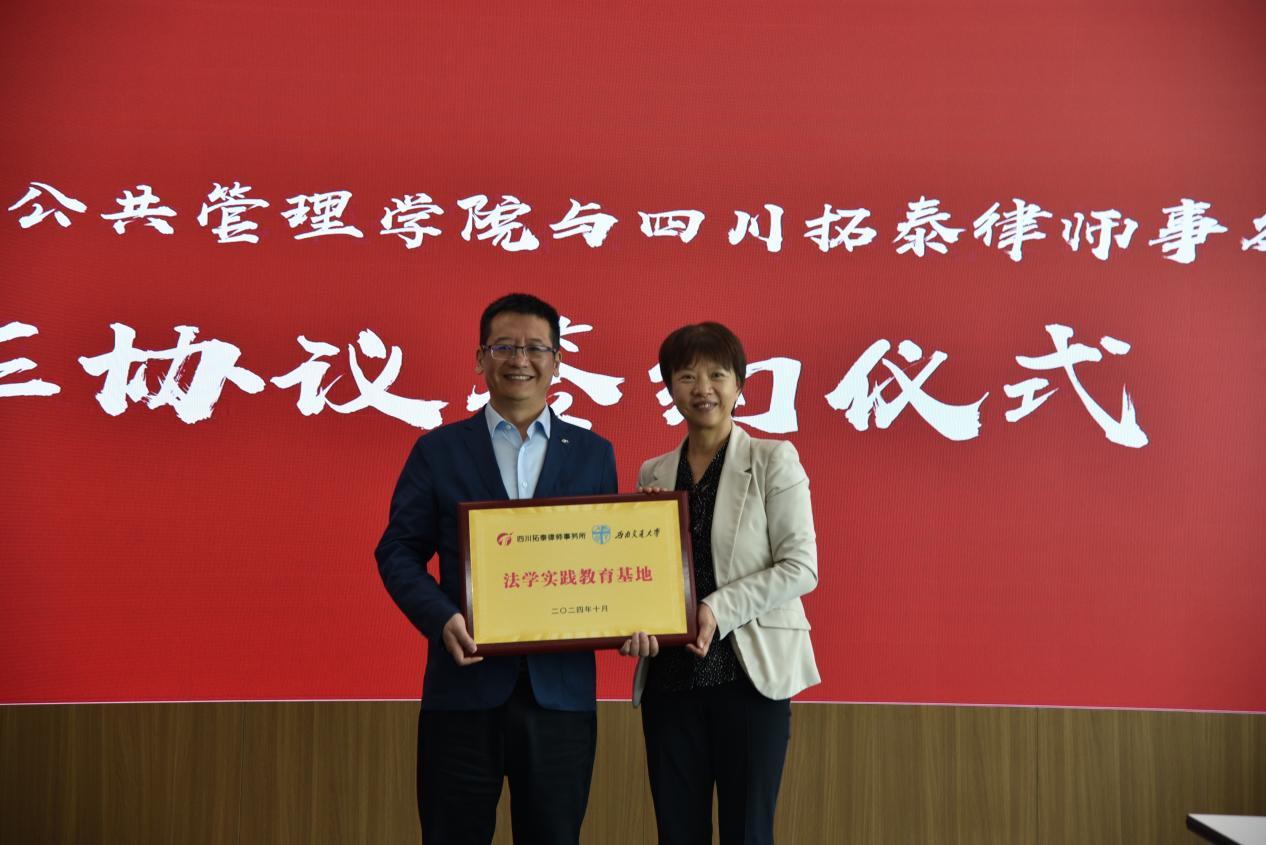 为加强校企链接、助力学生未来发展、进一步推动学院法学教学科研与法律实务深入融合发展,2024年10月28日,学院与四川拓泰律师事务所举行了院所合作协议签约仪式暨实践教育基地授牌仪式。参加本次院所合约签约仪式的有:西南交通大学公共管理学院党委书记高凡教授、法学系康黎副教授、学工组副组长莫太林,四川拓泰律师事务所主任尹冬生、党支部书记、执行主任吴苛政、管委会副主任李孟松、管委会副主任聂巧、合伙人李培辉、合伙人黄礼、合伙人郭义靖等。