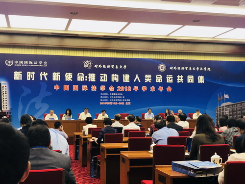 2018年5月19日-20日,由中国国际法学会主办、对外经济贸易大学承办、对外经济贸易大学法学院协办的“中国国际法学会2018年学术年会暨‘新时代新使命 推进构建人类命运共同体’学术研讨会”在北京国二招宾馆隆重召开。中国国际法学会成立于1980年,是外交部主管的全国性学术团体。来自外交部、商务部、最高人民法院、中国国际贸易促进委员会、中国国际经济贸易仲裁委员会等政府和实务部门以及全国各大高校、科研机构等从事国际法研究的专家学者等500余人参加了此次学术盛会。