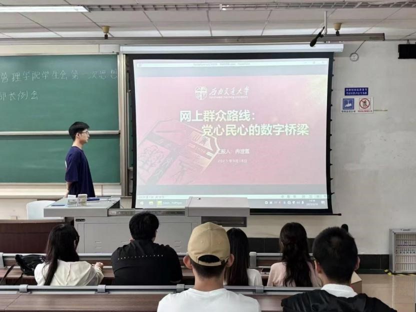 为深入学习贯彻习近平总书记关于网络强国的重要思想,提高青年学生干部的政治素养,公共管理学院学生会于2025年9月18日在九里校区四号教学楼4319教室,开展了“网上群众路线:党心民心的数字桥梁”主题理论学习会议,公共管理学院学生会主席团、部长团全员参与。